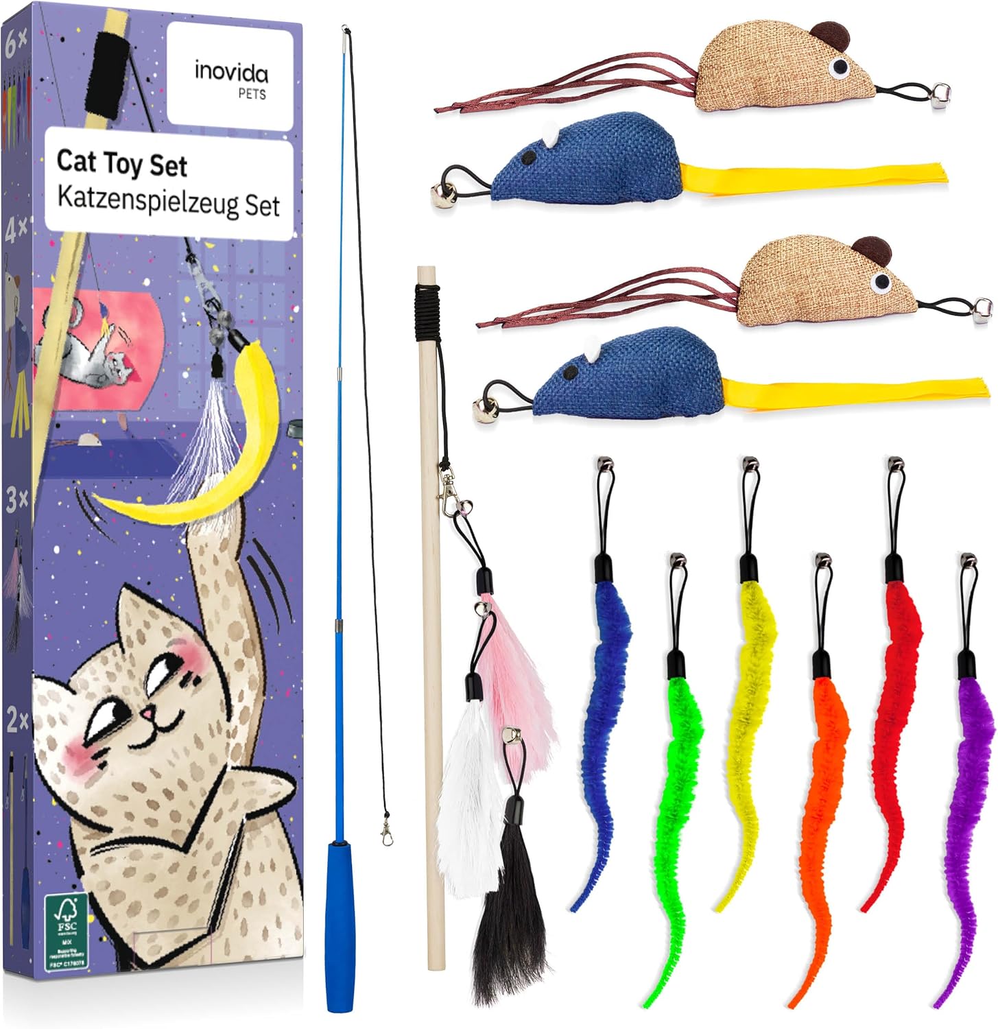 Cat Toy Set: XL 15 Pieces Cat Toy with Catnip - Vegan Toy for Cats with Cat Fishing, Feathers, Mouse, Worms - Kitten Toy Set Cats Gadgets