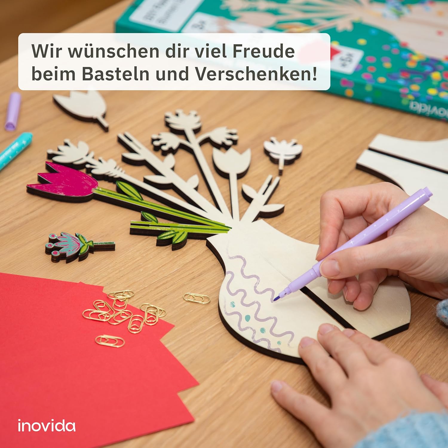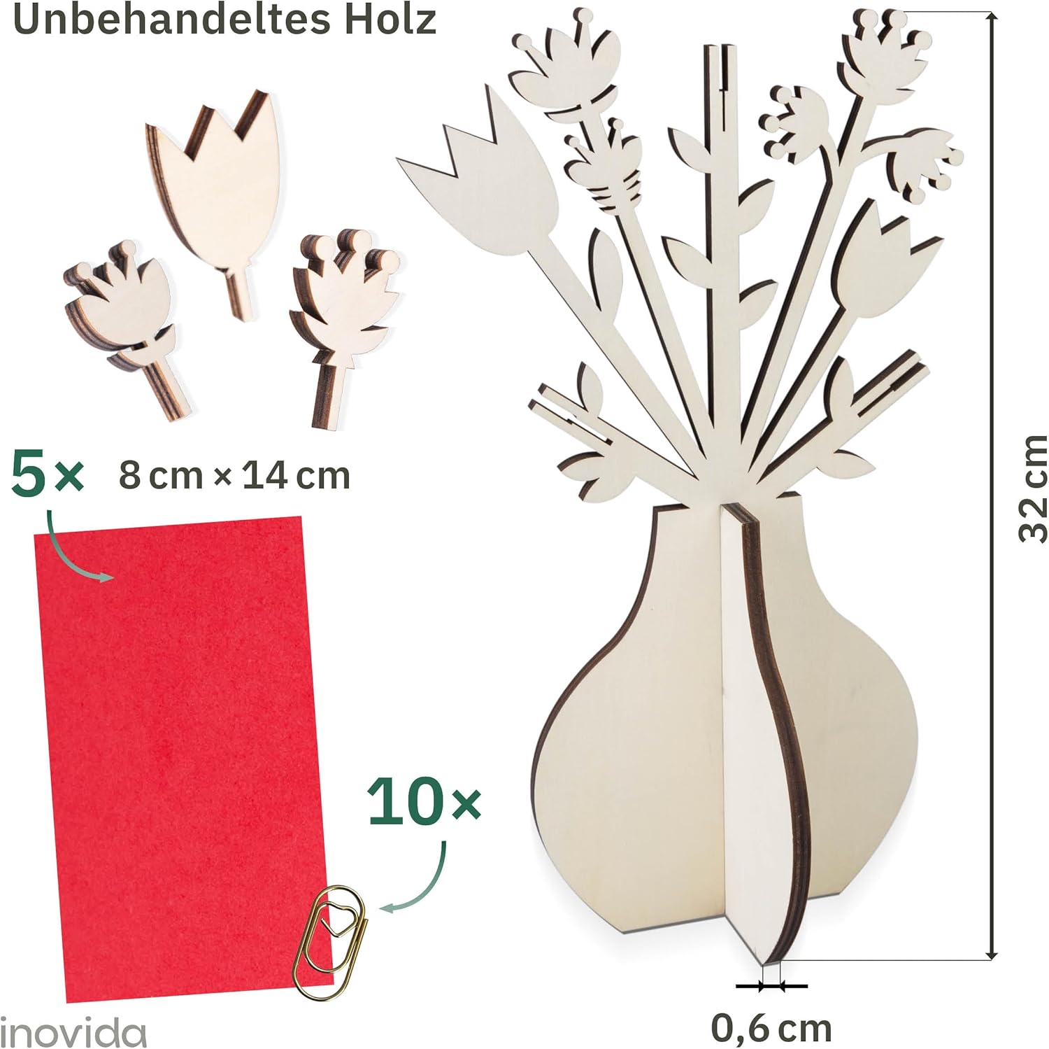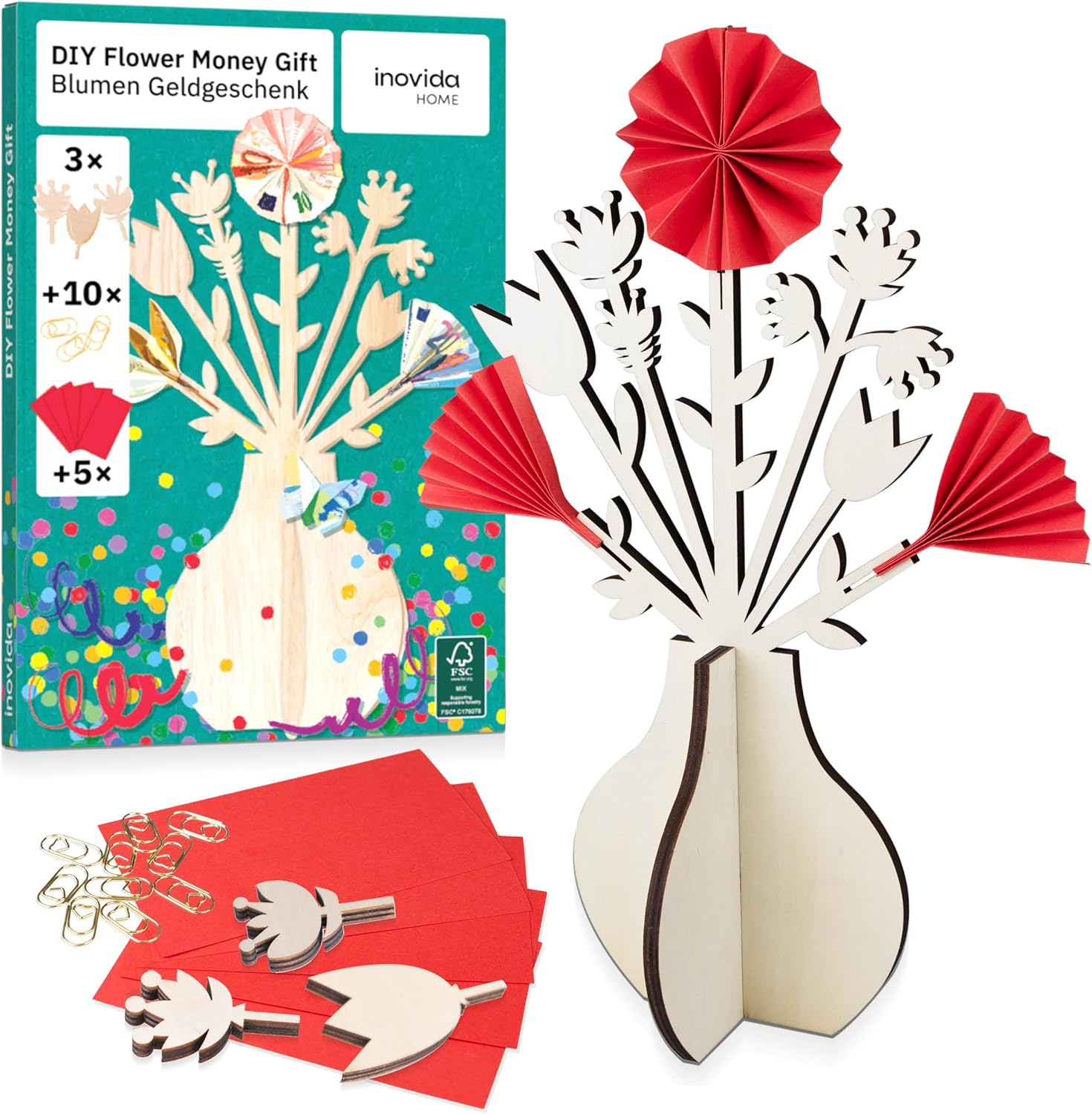 - The set for a flower money gift packaging includes: 1 flower vase made of poplar wood (32 x 19 x 19 cm), 3 wooden flowers for attaching, 10 paper clips for attaching, 5 pages of craft paper (14 x 8 cm)
